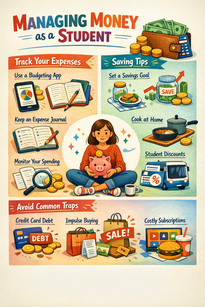 Topic: Managing money as a student: tracking expenses, saving tips, common traps